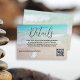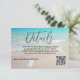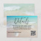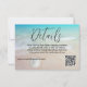 Wedding details card with a beach theme and option to reply online. Modern script "details" (or RSVP) at the top with a paragraph of printed text and place for website url as needed. Include a QR code for guests to easily access a reply location, or you may delete the code image in the design tool - "customize further". Tropical blue water and beach sand is the background with a little white sand dollar.