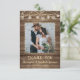Your wedding photo is accented with a rustic, country, brown weathered wood plank background and soft yellow glow string lights and mason jar lanterns along with the editable title of THANK YOU and your wedding date in a country western hand-printed font and your names in a rough brush script font. The back of the card features another photo and offers the option to type a general thank you message (or delete the sample text to leave blank for personal handwritten notes of appreciation). PHOTO TIP: For fastest/best results, choose a photo with the subject in the middle and/or pre-crop it to a similar shape as shown BEFORE uploading. Contact the designer via Zazzle Chat or makeitaboutyoustore@gmail.com if you'd like any customization or want coordinating items.
