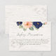 These easy-to-personalize wedding invitation safety precaution cards are a perfect fit for your wedding in a rustic country setting. They feature a light colored, white woodgrain background and floral accents in navy blue and soft peach or blush pink depicting peonies and roses with green foliage accents. The modern typography layout is a coordinating dark sage green for a romantic, gentle look.