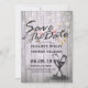 Save The Date Wedding Invitation Card Templates - Elegant Lettering Script, Vintage Champagne Glasses and String Lights on Rustic Wood Background.