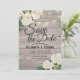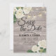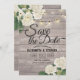 Save The Date Wedding Invitation Card Templates - Elegant White lovely Watercolor Hydrangea Flowers and String Lights on Rustic Wood Background.