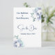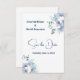 This wedding save the date invitation is shown in the white matte card paper with a modern layout of a watercolor art print of lovely blue and white flowers.