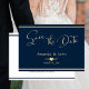 A Wedding Save The Date Navy Gold Engagement Card designed with elegant Gold colored text and heart on a dark Navy background. The Front Text includes: Save The Date, the Bride and Groom's First Names and Wedding Date. The Reverse text includes: The Bride and Groom's Full Names, Wedding Date and Formal Invitation To Follow, in a Navy colored text on a white background. To personalize, simply insert your details into our easy template, replacing the sample text.