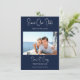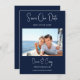 A Wedding Save The Date Photo Nautical Navy Theme in Dark Navy and White. To personalize simply insert your favorite couple's image into our easy template. Click FIT and ensure it is centered on the page. Next, insert your text into our easy template, replacing the sample Names, Wedding Date, and Location.