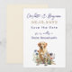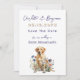 Wedding save the date cards with yellow lab in wildflowers design. Dark blue text with names first in handwritten script. Date is numeric in tan with dark blue shadow. Also include location city and state. A yellow Labrador retriever sits in wildflowers in the design at the bottom. Perfect for any couple including their dog in the wedding.