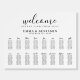 A 16 table wedding table seating chart with a modern wedding script and simple serif fonts. This minimalist wedding table chart sign features text only in black and white. The minimalist welcome is in a beautiful script font that also includes "welcome" and the bride and groom names in a simple serif font.