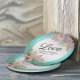 Elegant Wedding Shower Paper Plate Templates - Elegant Lettering Script and Vintage Watercolor Pink Flowers on Turquoise Teal Blue Green and Faux Gold Foil Confetti Polka Dots Background.