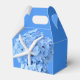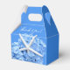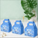 Blue wedding bridal shower or reception favor box with handle. Hydrangea flower and starfish design on pretty blue with white text to say, “thank you” to guests at the wedding or bridal shower. The sea-themed image decorates the front and back and contains a real, light blue hydrangea flower with a white sea star stuck into the petals. Text is handwritten script in white. The box will need to be folded after purchase. Read more about the product below.