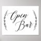Rustic Open Bar wedding sign with laurel decorative pattern.