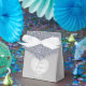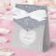 Personalized silver and glitter wedding favor box. The glitter is not real but a printed effect. Place your names inside the heart and the date of your wedding below.