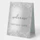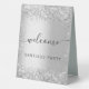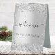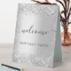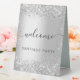A welcome sign for a party. A stylish faux silver looking background decorated with confetti. Personalize and add your name. Black letters.