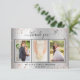 Add 3 of your own photos and a thank your note. A faux silver looking background with black text and frame, rose gold faux sparkles. The text: Thank you on the front and your names on the back are written with a stylish hand lettered script with swashes and a heart.