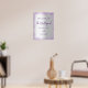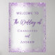 A faux silver looking background, decorated with purple faux sparkles. With the text: Welcome to The Wedding of. Personalize and add your names. Purple text.