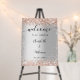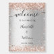 A welcome board for a wedding. A stylish faux silver looking background decorated with rose gold faux sparkles. Personalize and add your names and the wedding date. Black letters.
