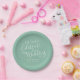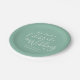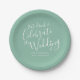 Green modern white text script and white heart wedding paper plates. Typographical text reads Eat, drink & celebrate the wedding of then add your own names underneath. A great personalized addition to your wedding buffet or party tables. Other matching items and colors available in this design. © Original design by Sarah Trett www.sarahtrett.com for www.mylittleedenweddings.com