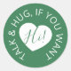 Social distance wedding green color-coded sticker. Help your guests feel safe and let other guests know what level of social distancing you are comfortable with. Code green wedding warning sticker reads Hi! Talk & hug, if you want. Matching posters and instructions are also available. Designed by www.mylittleedenweddings.com