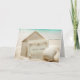 An intricately designed card with a floral border rests on the sand alongside seashells, with a vivid turquoise sea in the background