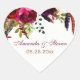 This beautiful burgundy watercolor florals and feathers heart shaped wedding sticker or envelope seal features burgundy, crimson, aubergine, and cream roses or peony type flowers with greenery leaves and branches in shades of olive green, rust, burnt orange, and brown, along with assorted colorful feathers in orange, purple, gray, and black. The customizable wording is in a gold and burgundy color palette.