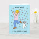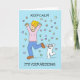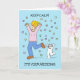 A simple illustration of a blond haired lady and a white cat running through confetti in a panic. The image is set against a pale blue colored background. A fun card to send to any bride who is starting to panic about her wedding arrangements!