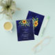 A navy blue background decorated with sunflowers, eucalyptus greenery. The blue color is uneven. Personalize and add your names and party details.