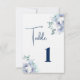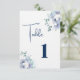 This wedding table card is shown in the white linen card paper with a modern layout of a watercolor art print of lovely blue and white flowers.