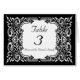 Lovely wedding reception table number card done in black and white. A ornate baroque style frame, in black and white, surrounds the white text area. Text is fully customizable in font style, colors, and sizes.