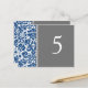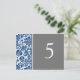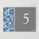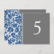 Elegant and classic dark navy blue, gray and white wedding table number cards with classic and chic vintage floral damask pattern. Customize these cards to create custom table number cards for each table at your wedding. Pattern available in a wide range of matching wedding products.
