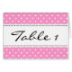 Wedding table number cards with elegant pink polka dot design. Customizable background color to match your wedding theme. Handy note cards to help guest find their table place. View our shop for more elegant wedding table setting designs.