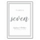 This design was created for smaller intimate wedding celebrations. Simple, minimalist and elegant Wedding Table Number SEVEN design features a contemporary design with a double frame border in gray on a crisp white background. The chic design provides timeless yet modern sophistication. Personalize wedding table design with your wedding details in trendy ultimate gray lettering and script. The back of the card is a duplicate of the front. Order one for every table with the individual table numbers.