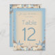 A beautiful destination wedding table number with an exotic beach theme. A pretty sand texture background pattern in neutral cream tones and shades of ocean blue is scattered with lots of little beach pebbles. On top of the pebbles are a variety of sea shells, sea urchins, starfish and pearls.