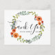 Classic wedding thank you post card template features a floral wreath on the front, and a customizable message at the back. You can personalize it with the customize it button. Send out your wedding thank you message as newly weds to your friends and family using this beautifully, simple thank you wedding photo postcard with the words "thank you" written in a white handwriting script text overlay.