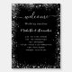 A modern black background, decorated with faux silver sparkles. Personalize and add your names and your wedding day timeline. White text.