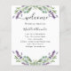 White elegant background, decorated with lavender florals, flowers and eucalyptus greenery. Personalize and add your names and your wedding day timeline.