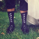 Dress the men of your wedding party with coordinating personalized black socks. "Uncle Of The Groom" is written down the front of the socks in bold white typography. Personalize with your first names and wedding date in simple white typography.