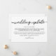 Modern simple wedding update announcement card. Design features calligraphy script ''wedding update'' and details in trendy capital lettering.