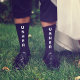 Dress the men of your wedding party with coordinating black personalized socks. "Usher" is written down the front of the socks in bold white typography. Personalize these souvenir keepsake socks with your first names and wedding date in simple white typography.