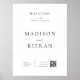 This elegant wedding welcome poster sign features a minimalist design with clean lines and a modern aesthetic. The text is centered and framed with a thin black border, providing a polished and sophisticated look. The poster warmly greets guests to the wedding ceremony and highlights the couple's names in bold, stylish fonts, creating a striking focal point. At the bottom, the sign includes the wedding date and location in a small, refined font. Additionally, there is a QR code on the bottom right, inviting guests to scan and view the wedding program digitally, adding a contemporary touch to the classic design. The overall layout is sleek, simple, and effective, perfect for a modern wedding.
