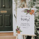 Rustic Christmas theme wedding welcome sign featuring watercolor illustration of winter botanicals including, mistletoe, pine tree branch, berries, orange, etc.