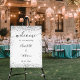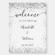 A welcome board for a wedding. A stylish white background decorated with faux silver glitter sparkles. Personalize and add your names and the wedding date. Black letters.