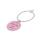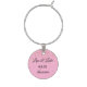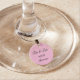 This wedding wine glass charm is shown in a pink background color with a golden stars print with the text bride & groom names, date and forever in the black color.