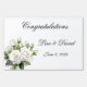This yard sign is perfect for your wedding reception celebration, shown with a white background panel with a lovely white rose bouquet.