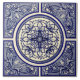 A perennially popular blue and (off) white transferware tile, the original this was reproduced from is a 19th century Victorian Renaissance Revival tile by Josiah Wedgwood & Sons. It features a center medallion framed by decorative corner pieces featuring cherubs, fruit, and fleur de lis.