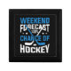 Hockey player gift box with a humorous saying features white and blue text on a black background that reads Weekend Forecast 100% Chance of Hockey!