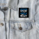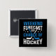 Hockey player button with a humorous saying features white and blue text on a black background that reads Weekend Forecast 100% Chance of Hockey!