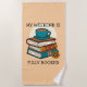 Whimsical beach towel design for book lovers and bookworms. An illustration of a cosy pile of books with a coffee cup balanced on the top. The colours are blues, reds and oranges. Above and below the image are the words 'My Weekend Is Fully booked' in black text. These are templates for you to add your own words if you wish to change them.