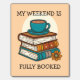 Whimsical drink mix design for book lovers and bookworms. An illustration of a cosy pile of books with a coffee cup balanced on the top. The colours are blues, reds and oranges. Above and below the image are the words 'My Weekend Is Fully booked' in black text. These are templates for you to add your own words if you wish to change them.