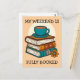 Whimsical postcard design for book lovers and bookworms. An illustration of a cosy pile of books with a coffee cup balanced on the top. The colours are blues, reds and oranges. Above and below the image are the words 'My Weekend Is Fully booked' in black text. These are templates for you to add your own words if you wish to change them.