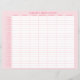 This medication tracker features a pink background with a grid that includes times by the hour on the left side and days of the week on the top side. You can personalize with your name.