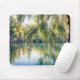 Willow tree branches hang gracefully over a calm, reflective lake surrounded by lush green foliage