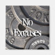 Photograph of several weightlifting plates with customizable text, "No excuses."